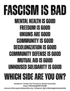 Join participants of the Providence General Assembly for an action to fight back and build community. Connect with members of the various working groups that compose the General Assembly. Bring food and coats that will be redistributed to neighbors who need them.
